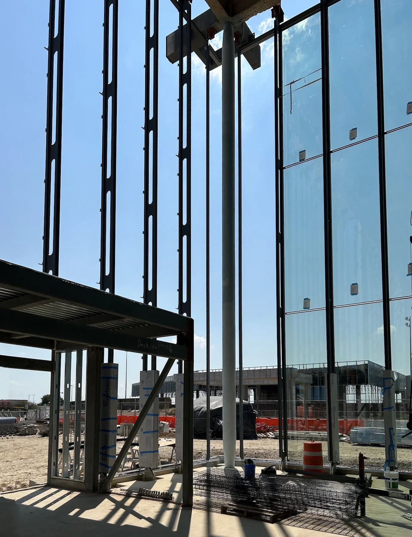 2 concealed splice joints connect three mullion lengths to achieve the 54’ free-span facade.