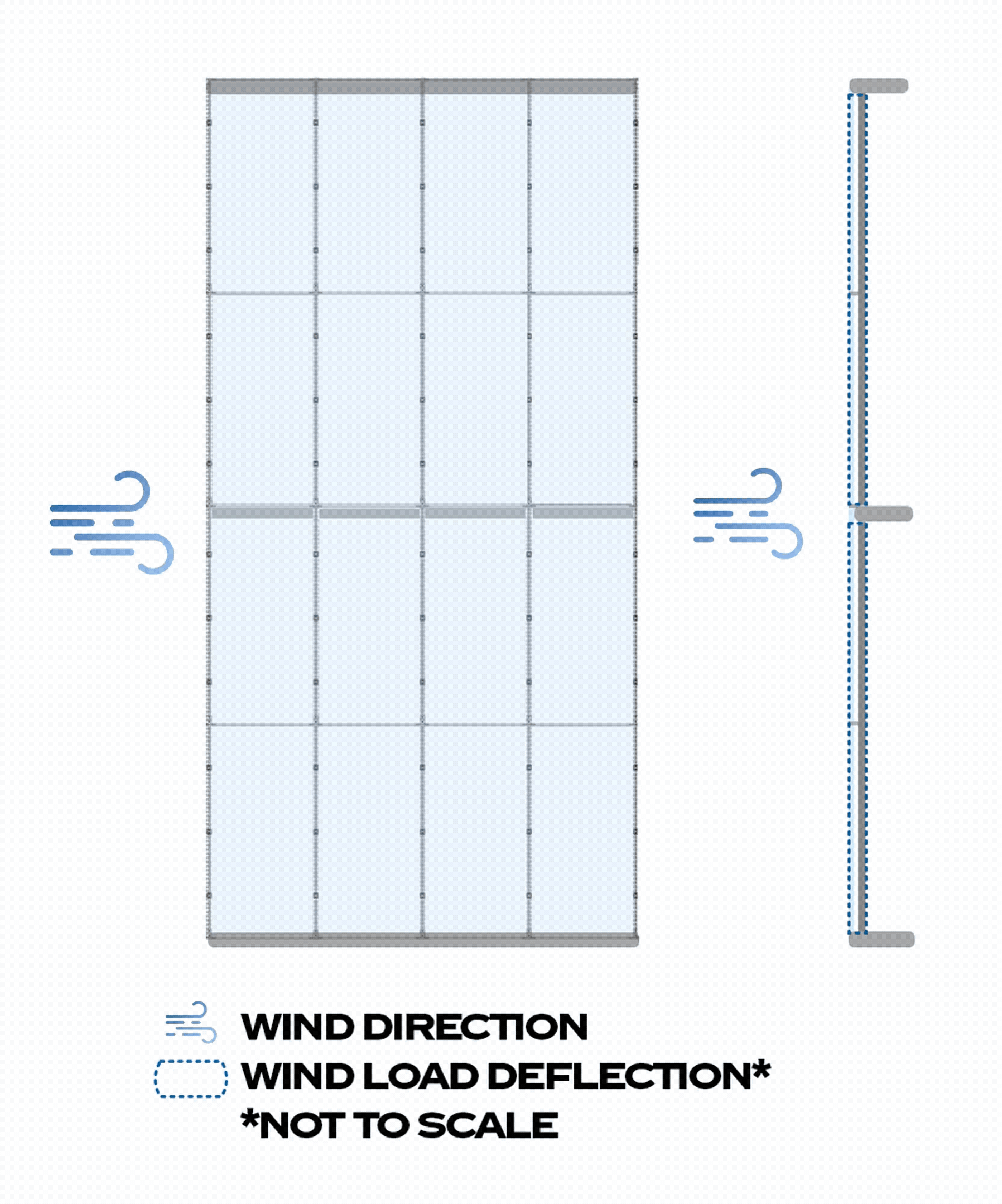 c. Wind loads cause facade deflections between anchor points, with the maximum deflection occurring at the mid way point between anchors. See blue overlay in Figure 1.