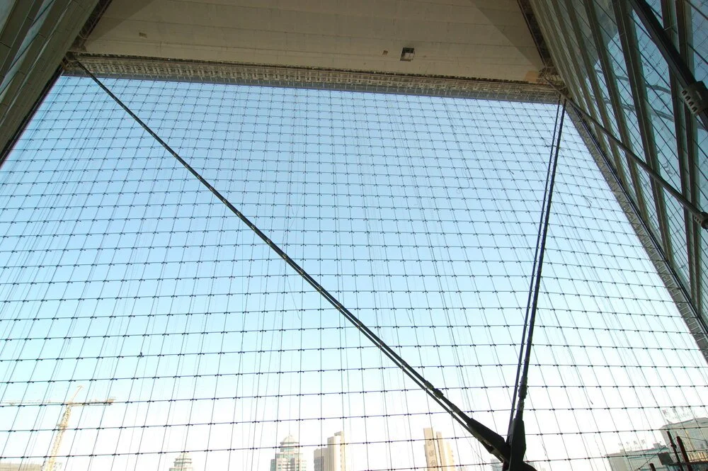 [5] A key attribute with cable net facades that significantly contributes to their high costs is the need for a substantially stiff boundary structure on all four sides. (Think of a giant tennis racquet.) Although mostly hidden this structure resists the high pre-stress loads which can be +/-60kips at 5ft o.c. around the perimeter. The cost of this boundary structure needs to be considered when evaluating cable net facade solutions to get a true wall cost estimate · Back↑
