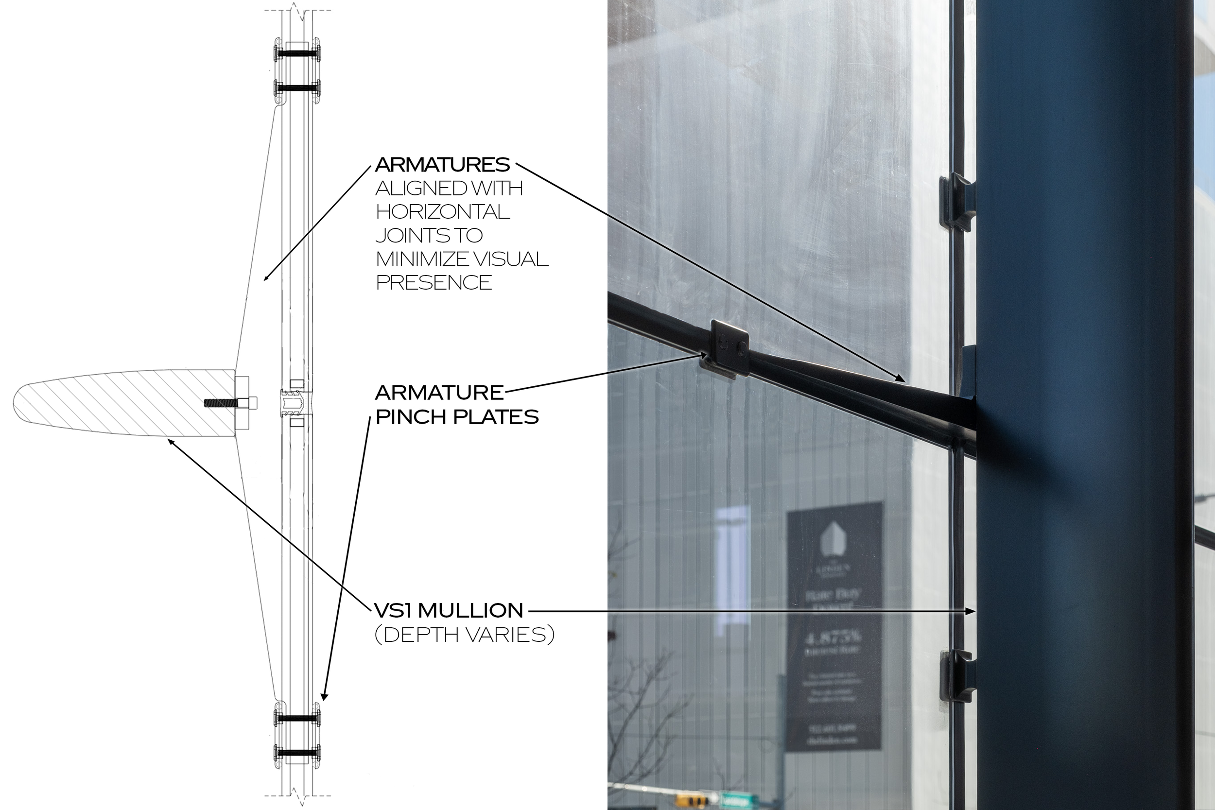 Excessive glass stresses and deflections can be eased by adding armatures to the corner mullions at the horizontal joints.