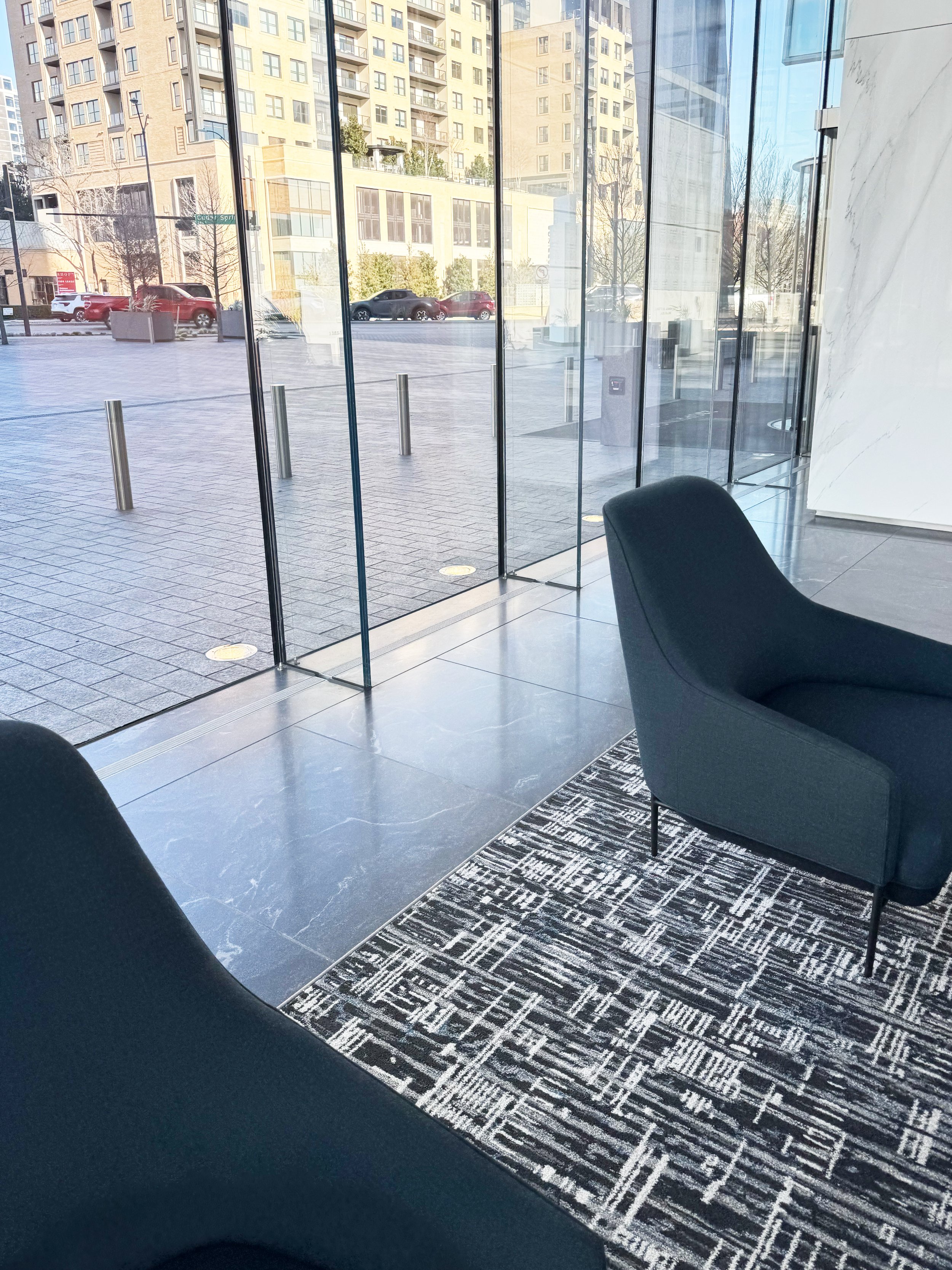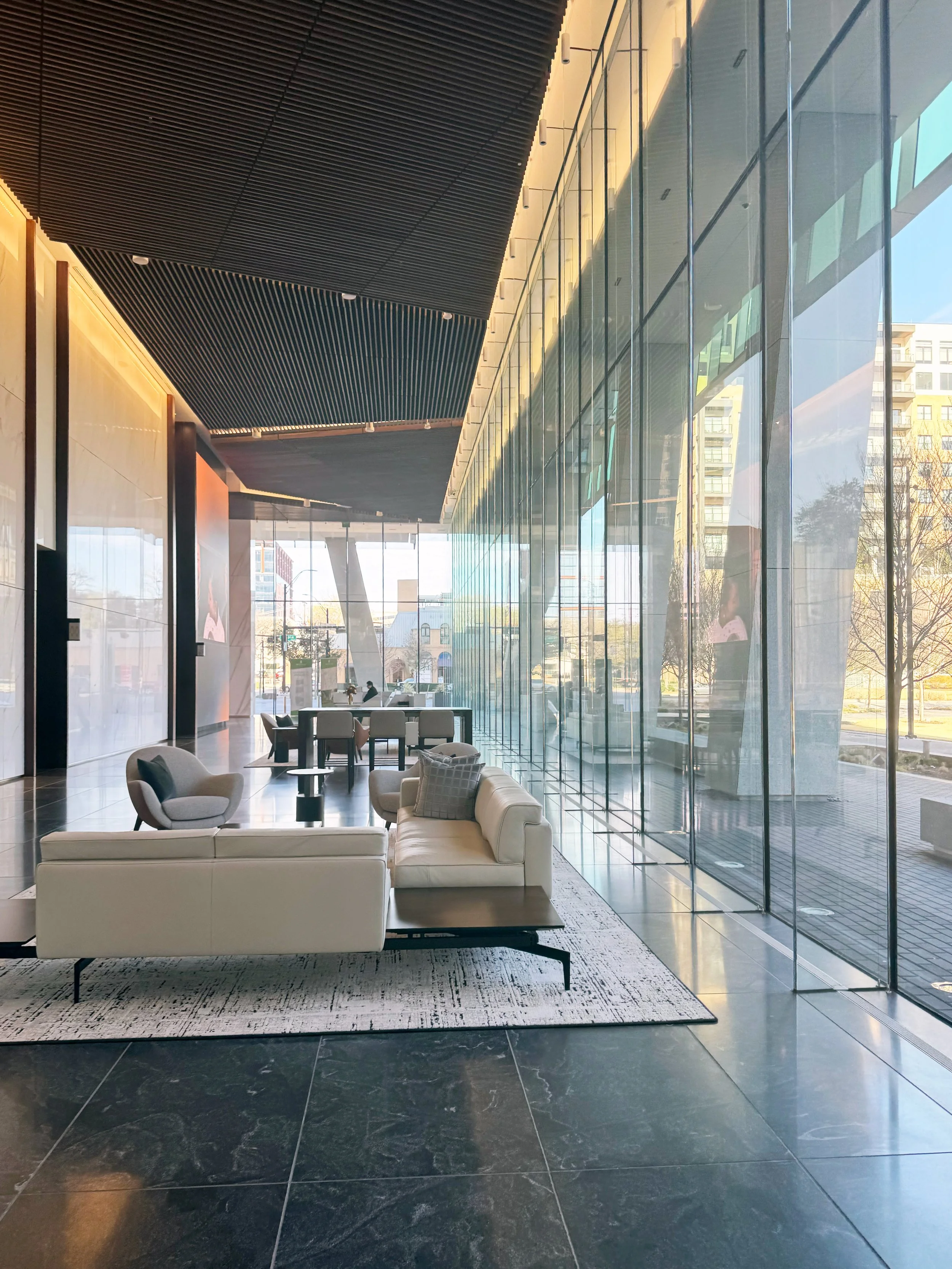 A valued longtime partnership with Harmon led to the selection of VS1-G200 for the four-elevation lobby scope on this new office tower in Texas. Designed by Dallas-based firm GFF, the design intent was to create a slender tower with maximized public space at the street level. The remarkable transparency of VS1-G200—which swaps a structural glass fin for the original aluminum mullion and uses no visible metal fittings—contributes to that goal by visually tapering the building’s silhouette down to its core at the lobby level.