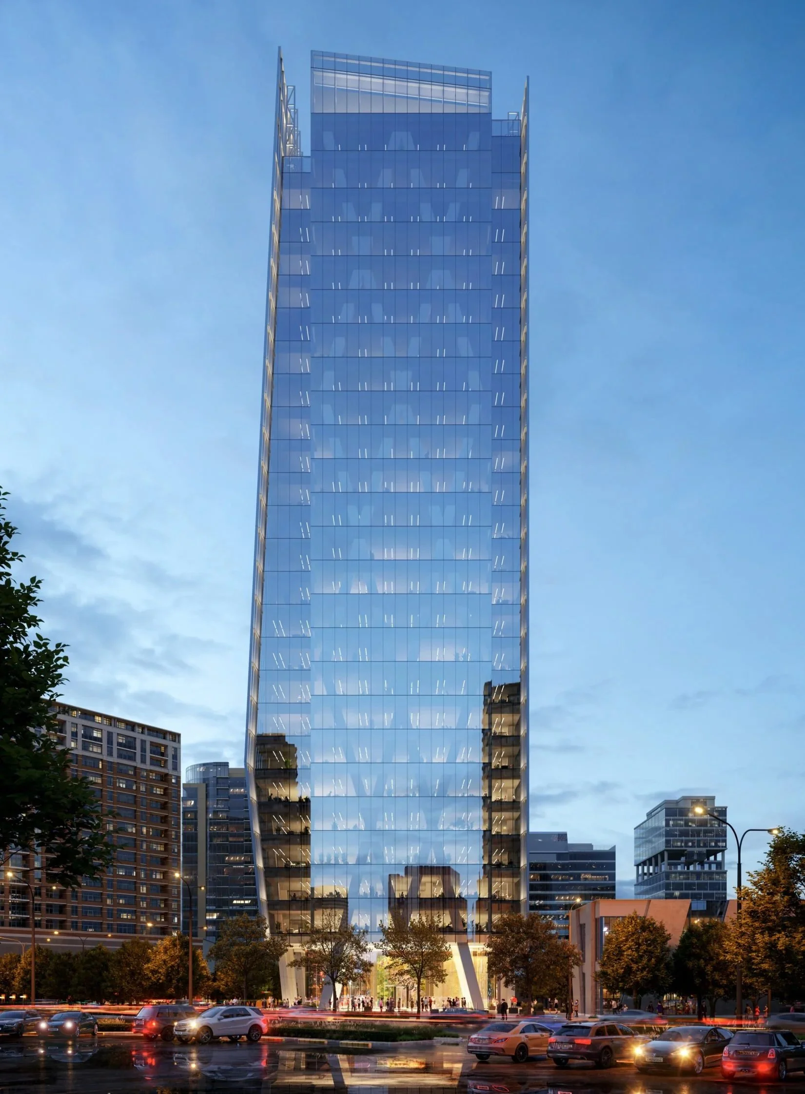 Tower and VS1-G glass lobby rendering courtesy of GFF