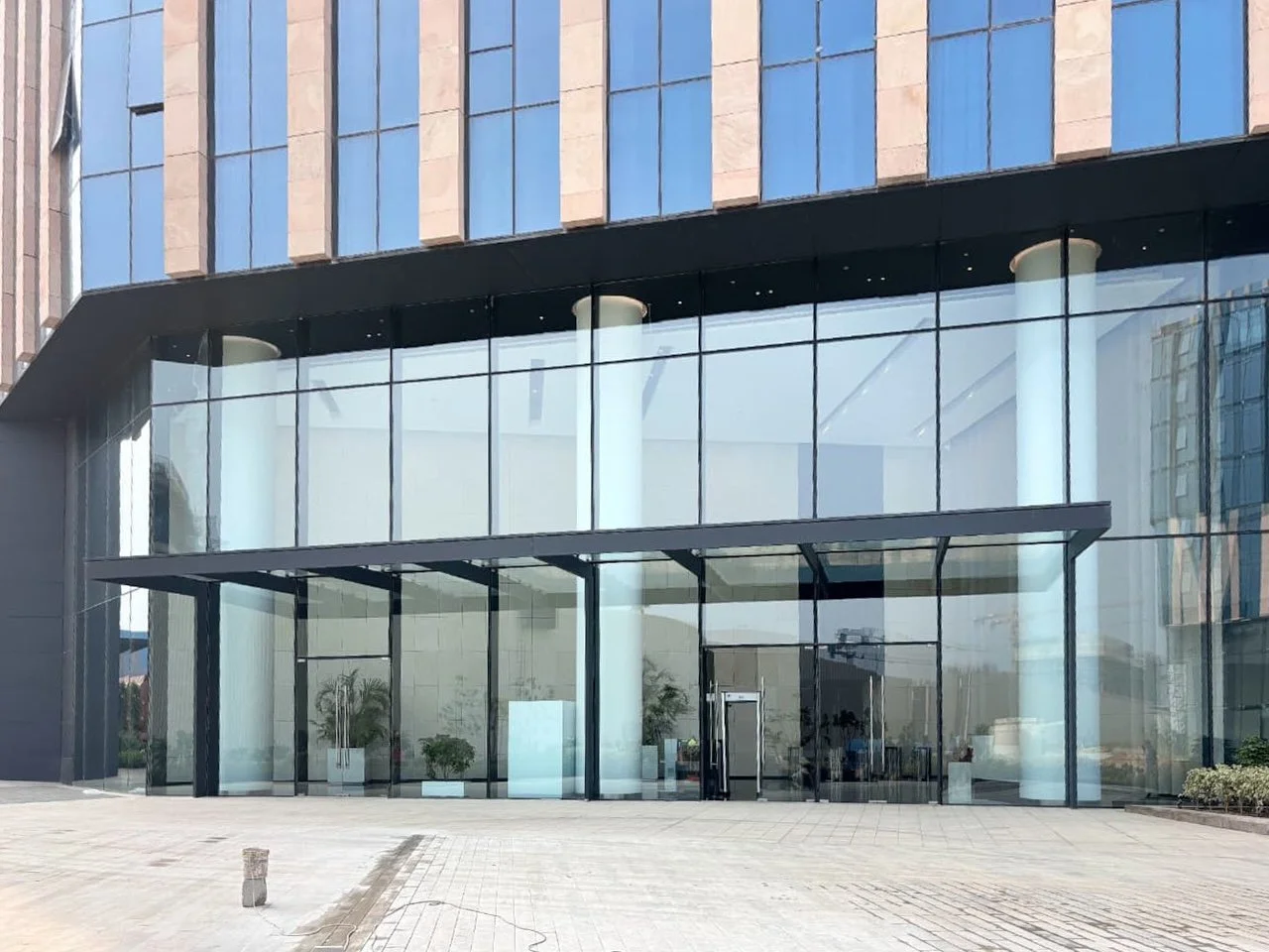 A signature highlight of this project is the entrance lobby facade, engineered with the advanced VS1 324mm (12¾”) rectangular mullion. The design achieves a remarkable 13.3-meter (43’ 7”) unsupported span, welcoming visitors with an open and visually striking architectural statement. Patch-fitted glass doors are seamlessly incorporated into the facade, and above is a canopy with no diagonal bracing, supported exclusively by VS1 mullions. Together the facade and canopy form a clean, sleek, and structurally expressive facade language that elevates the entrance experience.