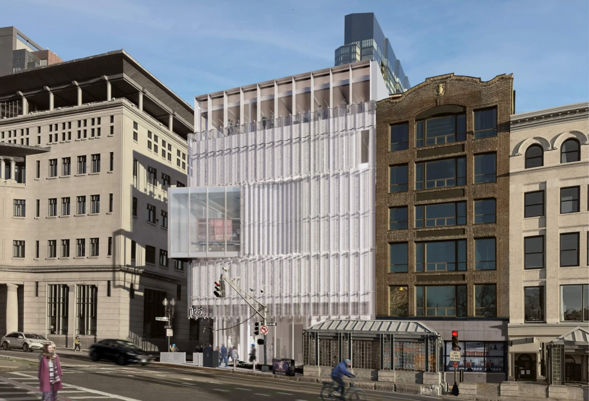 The building will be clad in a metal fabric that “evokes the curtains that remained drawn in Jewish households at the time of the Nazi rise to power.” Emerging from the curtains will be an 18-foot VS1 facade above the entryway showcasing a feature exhibit. Pointing north will be an acute all-glass corner, a standard detail of the VS1 technology.