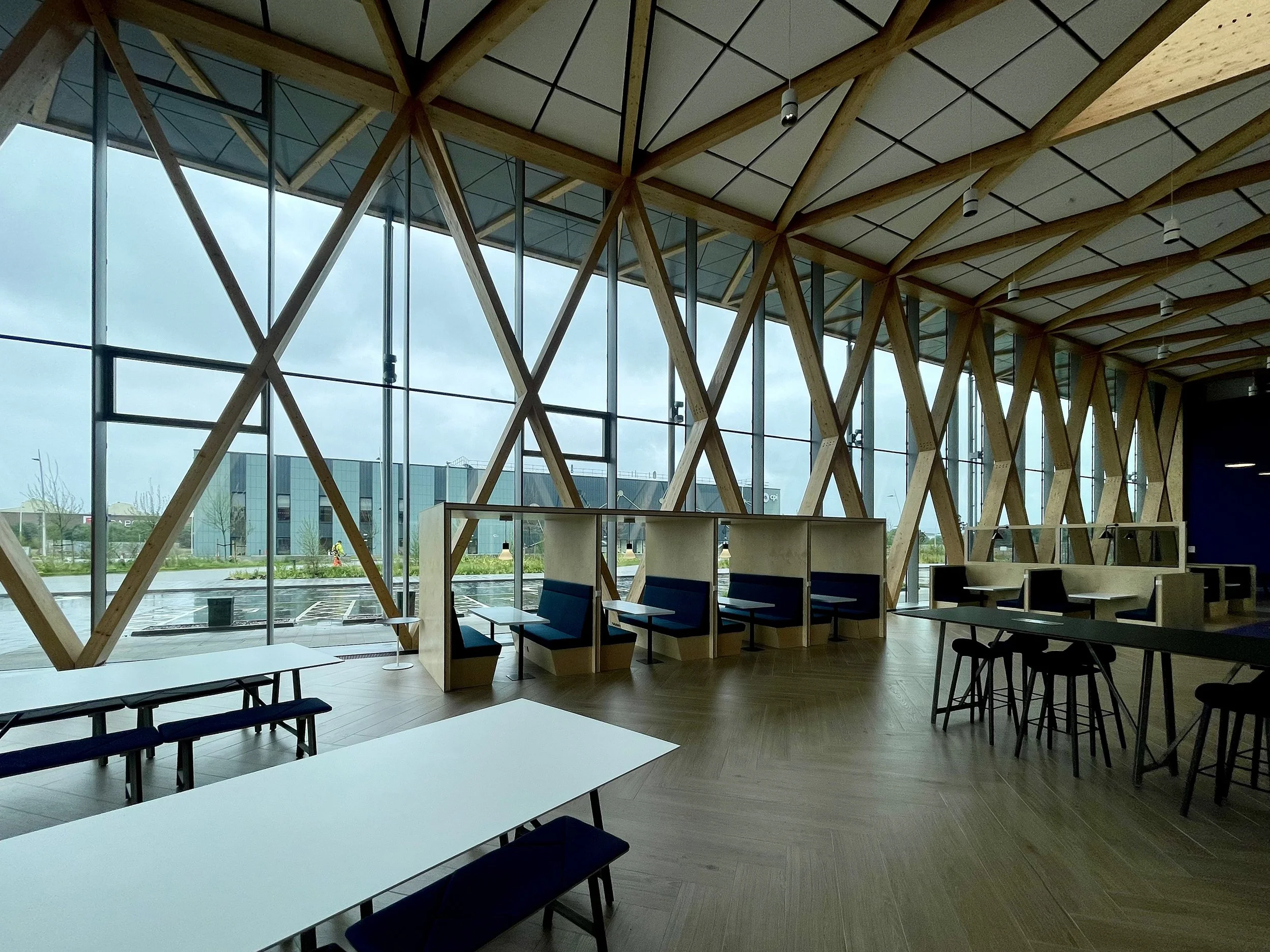 This new hub for manufacturing innovation in Glasgow is enclosed by a 10 meter VS1 facade. The largest glass utilized are 2m by 4m panes, and awning windows are integrated directly into the facade.