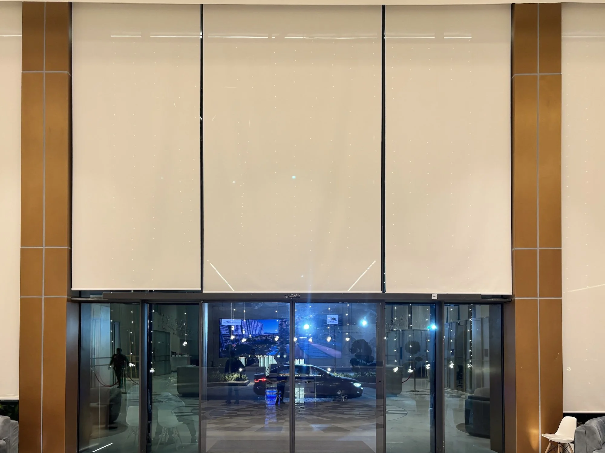 A sleek automated sliding door sits beneath the canopy, framed within a minimalist aluminum portal. The design maximizes transparency and ensures a seamless visual flow between the exterior façade and the interior experience.