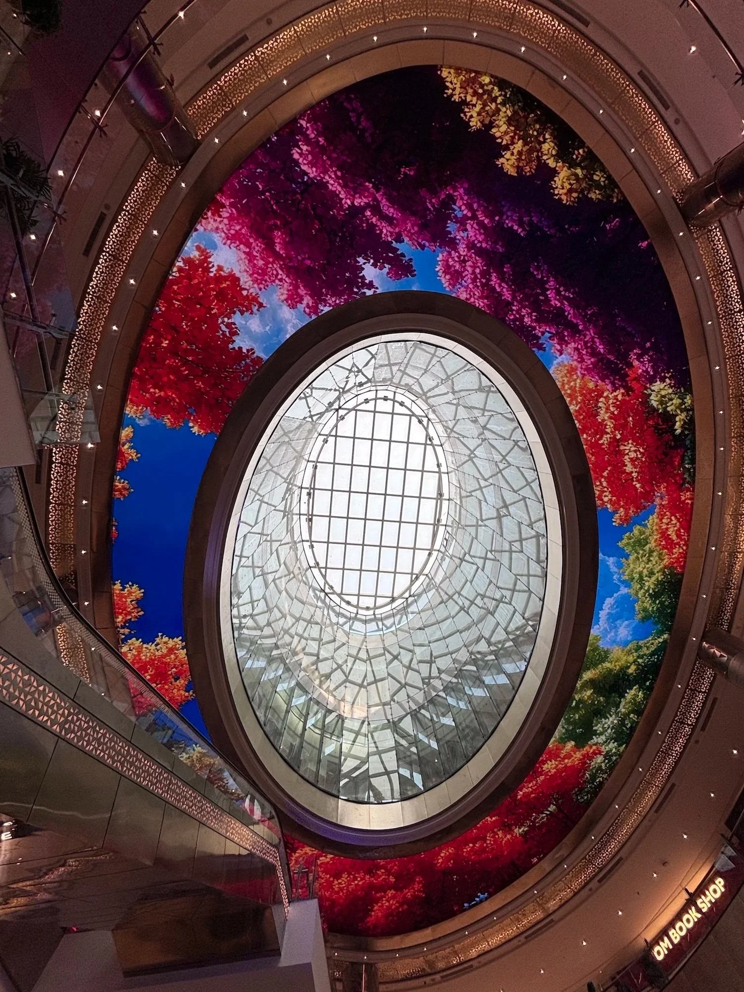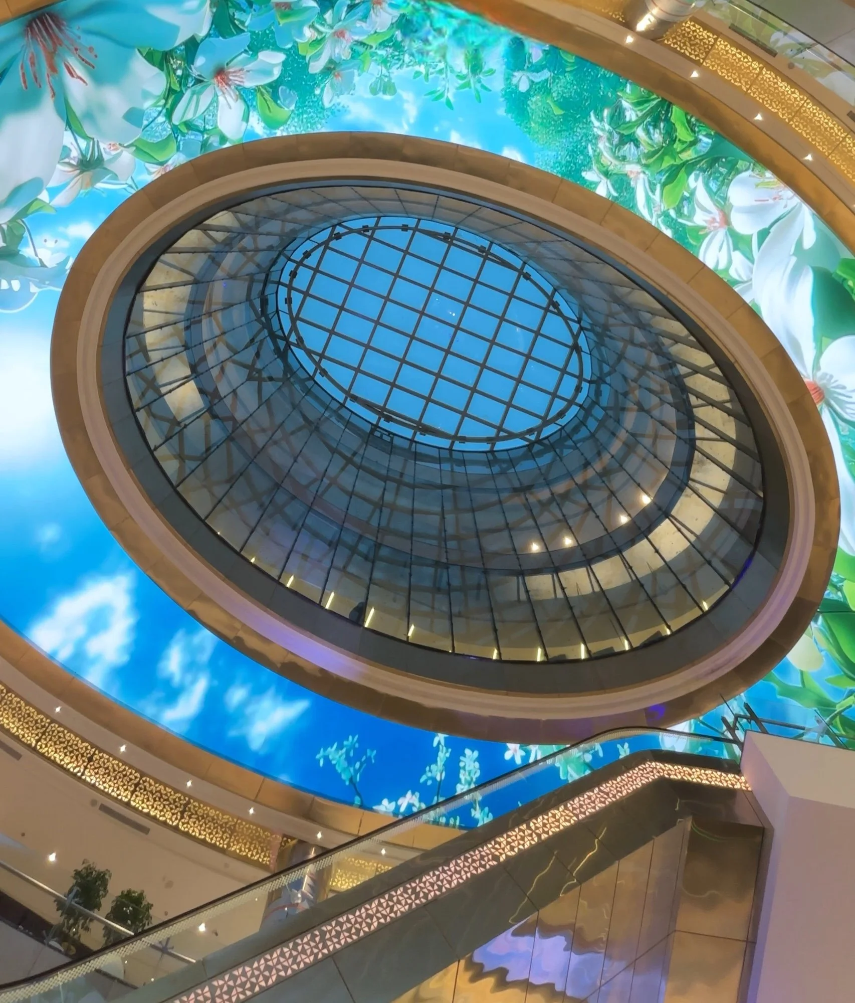 At the heart of Unity One Elegante mall is an iconic circular atrium, featuring a dramatic ceiling installation with a curved, large-format digital screen. This immersive element enhances the sense of vertical openness while serving as a dynamic focal point that blends ambient lighting and multimedia content to elevate the overall visitor experience.