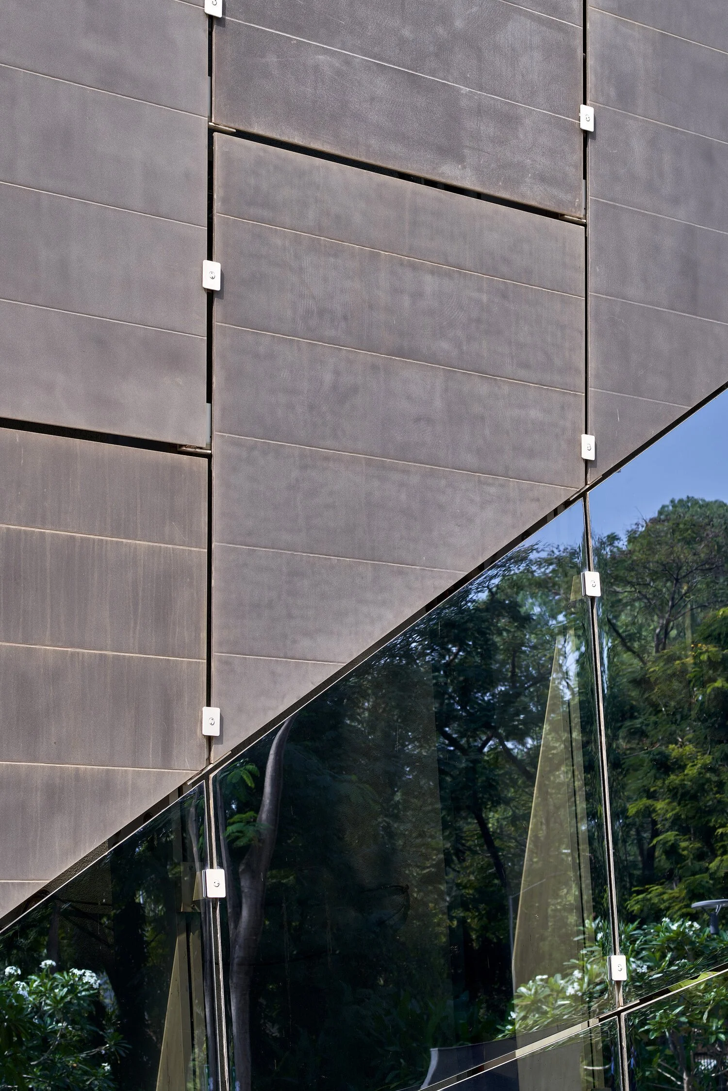 Terra cotta-painted glass panels on the Cummins Technology Center in Pune, India